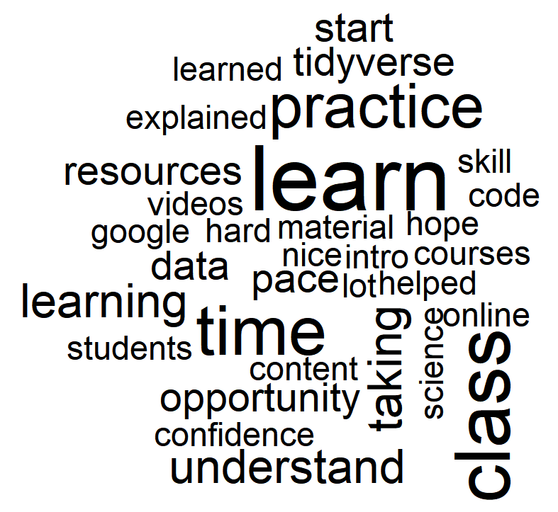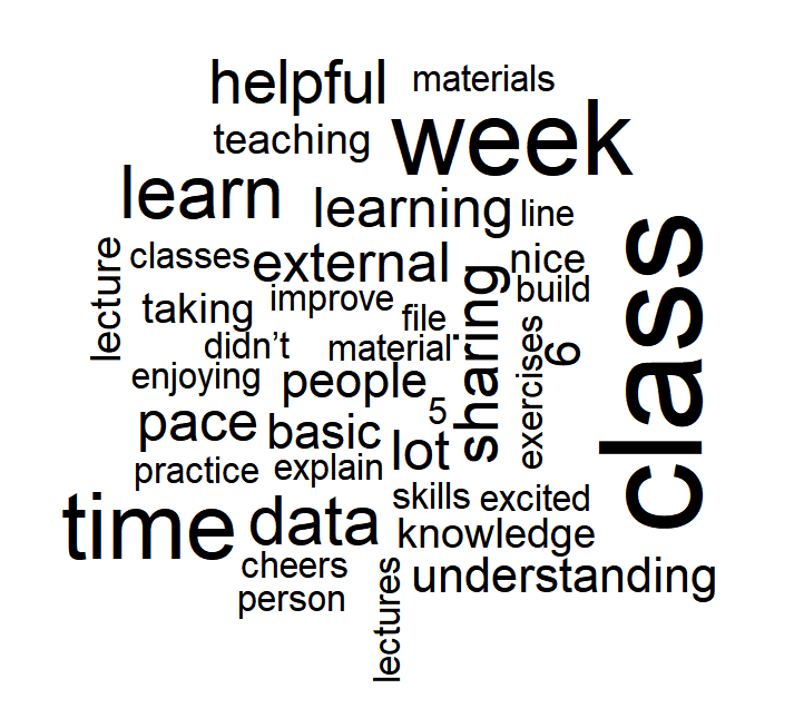 I am very happy that because of this class I can build up my self-confidence to work in R. It helps me a lot. With the help of all the exercises, I can practice R on my own data too. Thank you so much. Want to learn more :)
