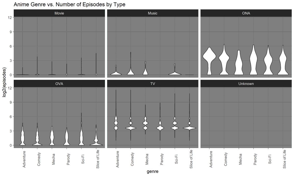 #TidyTuesday is all about #anime. Here are the log2 of number of episodes for 6 different genres split out by anime type. Interesting you can see the bulges in the TV type, which probably correspond to seasons of a show.